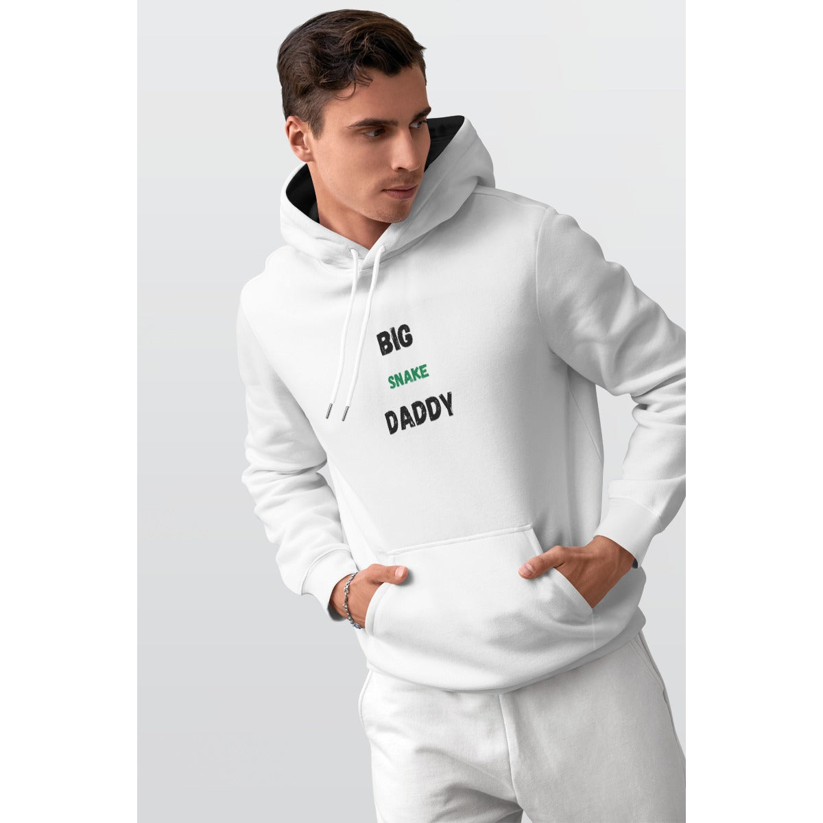 - Drawstring, front pocket and black inner hood